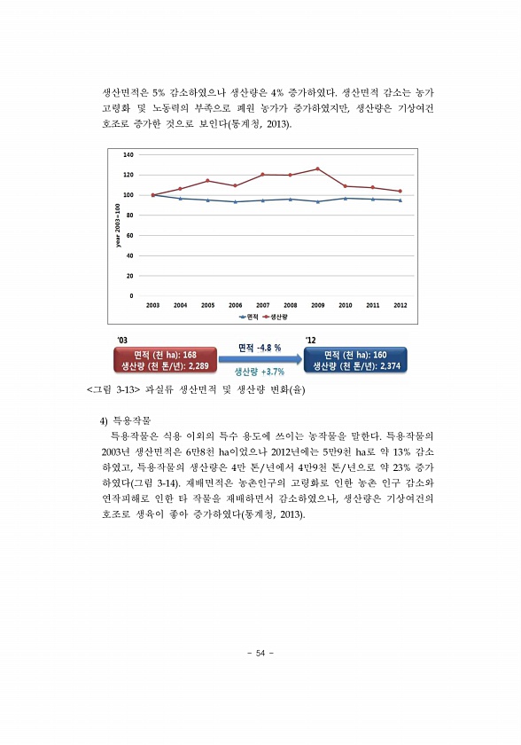54 생산면적은 5% 감소하였으나 생산량은 4% 증가하였다. 생산면적 감소는 농가 고령화 및 노동력의 부족으로 폐원 농가가 증가하였지만, 생산량은 기상여건 호조로 증가한 것으로 보인다 통계청, 2013 그림 3-13 과실류 생산면적 및 생산량 변화 율 4 특용작물 특용작물은 식용 이외의 특수 용도에 쓰이는 농작물을 말한다. 특용작물의 2003년 생산면적은 6만8천 ha이었으나 2012년에는 5만9천 ha로 약 13% 감소 하였고, 특용작물의 생산량은 4만 톤/년에서 4만9천 톤/년으로 약 23% 증가 하였다 그림 3-14 재배면적은 농촌인구의 고령화로 인한 농촌 인구 감소와 연작피해로 인한 타 작물을 재배하면서 감소하였으나, 생산량은 기상여건의 호조로 생육이 좋아 증가하였다 통계청, 2013