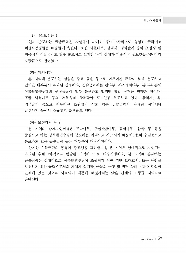 Ⅱ. 조사결과 www.nie.re.kr ? 59 2 식생보전등급 현재 분포하는 곰솔군락은 자연림이 파괴된 후에 2차적으로 형성된 군락이고 식생보전등급은 Ⅲ등급에 속한다. 또한 사철나무, 참억새, 멍석딸기 등의 초원성 및 저목성의 식물군락도 일부 분포하고 있지만 나지 상태와 더불어 식생보전등급은 각각 Ⅴ등급으로 판단했다. 라 특기사항 본 지역에 분포하는 삼림은 주로 곰솔 등으로 이루어진 군락이 넓게 분포하고 있지만 대부분이 파괴된 상태이다. 곰솔군락에는 광나무, 사스레피나무, 돈나무 등의 상록활엽수림대의 구성종군이 일부 분포하고 있지만 발달 상태는 빈약한 편이다. 또한 사철나무 등의 저목성의 상록활엽수도 일부 분포하고 있다. 참억새, 칡, 멍석딸기 등으로 이루어진 초원성의 식물군락은 곰솔군락이 파괴된 지역이나...