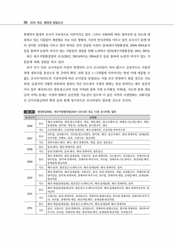 58 2015 독도 생태계 정밀조사 현재까지 환경부 조사가 지속적으로 이루어지고 있다. 그러나 국화과와 벼과, 명아주과 등 독도에 생 육하고 있는 식물들이 계절별로 서로 다른 생태적, 시간적 번식전략을 이루고 있어 조사시기 등에 따 라 상이한 군락형을 이루고 있어 학자들 간의 상당한 이견이 있어 대구지방환경청, 2010 DNA분석 등을 통하여 논란의 여지가 있는 식물들의 정립을 위해 노력하고 있다 대구지방환경청, 2012, 2013 최근 대구지방환경청의 보고 2012, 2013 에서는 DNA분석 등을 통하여 논란의 여지가 있는 식 물들에 대해 정립을 하고 있다. 과거 각기 다른 조사자들의 이견이 반영되어 조사 모니터링이 되어 왔으나 실질적으로 식물의 최대 생육기를 중심으로 한 군락의 확장 ? 쇠퇴 등은 1∼...