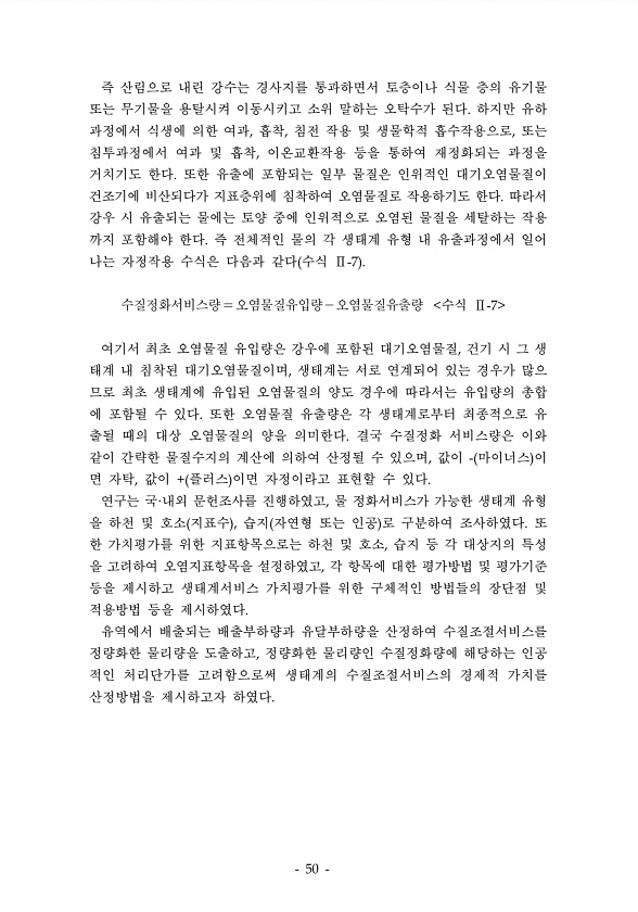 즉 산림으로 내린 강수는 경사지를 통과하면서 토층이나 식물 층의 유기물 또는 무기물을 용탈시켜 이동시키고 소위 말하는 오탁수가 된다 하지만 유하 과정에서 식생에 의한 여과 흡착 침전 작용 및 생물학적 흡수작용으로 또는 침투과정에서 여과 및 흡착 이온교환작용 등을 통하여 재정화되는 과정을 거치기도 한다 또한 유출에 포함되는 일부 물질은 인위적인 대기오염물질이 건조기에 비산되다가 지표층위에 침착하여 오염물질로 작용하기도 한다 따라서 강우 시 유출되는 물에는 토양 중에 인위적으로 오염된 물질을 세탈하는 작용 까지 포함해야 한다 즉 전체적인 물의 각 생태계 유형 내 유출과정에서 일어 나는 자정작용 수식은 다음과 같다 수식 수질정화서비스량 오염물질유입량오염물질유출량 수식 여기서 최초 오염물질 유입량은 강우에 포...