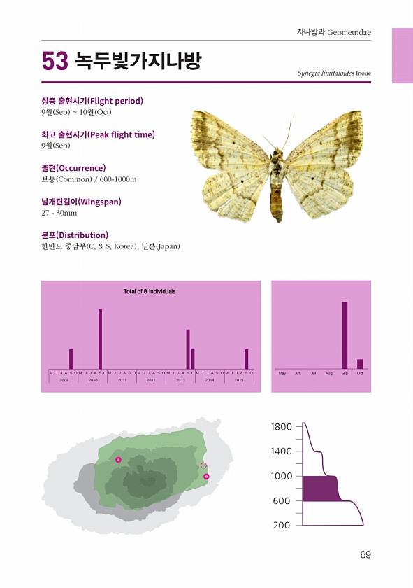 69 자나방과 Geometridae 53 녹두빛가지나방 성충 출현시기 Flight period 9월 Sep 10월 Oct 최고 출현시기 Peak fight time 9월 Sep 출현 Occurrence 보통 Common 600-1000m 날개편길이 Wingspan 27 30mm 분포 Distribution 한반도 중남부 C. & S. Korea , 일본 Japan Synegia limitatoides Inoue M J J A S O M J J A S O M J J A S O M J J A S O M J J A S O M J J A S O M J J A S O May Jun Jul Aug Sep Oct 2009 2010 2011 2012 2013 2014 2015 Total of 8individuals