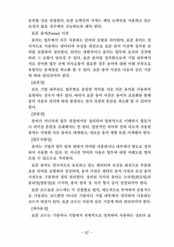 등록할 것을 권장한다. 또한 도메인의 삭제는 해당 도메인을 사용하고 있는 속성이 없을 경우에만 가능하도록 해야 한다. 표준 용어 Terms 사전 용어는 업무에서 자주 사용하는 단어의 조합을 의미하며, 표준 용어는 전 사적으로 사용하는 엔터티와 속성을 대상으로 표준 단어 사전에 정의된 단 어를 조합하여 정의한다. 단어는 개별적이나 용어는 업무와 조직의 성격에 따라 그 조합이 달라질 수 있다. 표준 용어를 정의함으로써 기업 내부에서 서로 상이한 업무 간에 의사소통이 필요한 경우 용어에 대한 이해 부족으로 유발되는 문제점을 최소화 할 수 있다. 표준 용어 사전은 다음과 같은 기준 에 따라 관리되어야 한다. [표준성] 같은 기업 내부라도 업무별로 동일한 의미를 서로 다른 용어를 사용하여 표현하는 경우가 매우 많다....