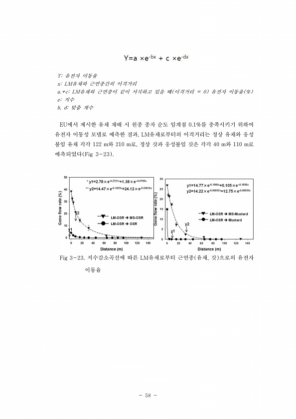 58 Y유전자 이동율 xLM유채와 근연종간의 이격거리 a.+cLM유채와 근연종이 같이 서식하고 있을 때 이격거리 = 0 유전자 이동율 % e지수 b, d맞춤 계수 EU에서 제시한 유채 재배 시 원종 종자 순도 임계점 0.1%를 충족시키기 위하여 유전자 이동성 모델로 예측한 결과, LM유채로부터의 이격거리는 정상 유채와 웅성 불임 유채 각각 122 m와 210 m로, 정상 갓과 웅성불임 갓은 각각 40 m와 110 m로 예측되었다 Fig 3-23 Fig 3-23. 지수감소곡선에 따른 LM유채로부터 근연종 유채, 갓 으로의 유전자이동율