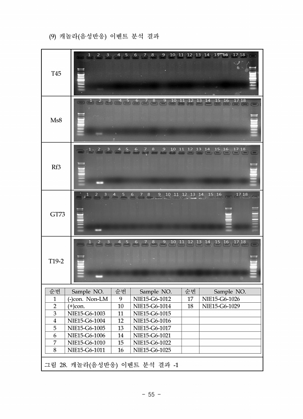 T45 Ms8 Rf3 GT73 T19-2 순번 Sample NO. 순번 Sample NO. 순번 Sample NO. 1 con. Non-LM 9 NIE15-G6-1012 17 NIE15-G6-1026 2 + con. 10 NIE15-G6-1014 18 NIE15-G6-1029 3 NIE15-G6-1003 11 NIE15-G6-1015 4 NIE15-G6-1004 12 NIE15-G6-1016 5 NIE15-G6-1005 13 NIE15-G6-1017 6 NIE15-G6-1006 14 NIE15-G6-1021 7 NIE15-G6-1010 15 NIE15-G6-1022 8 NIE15-G6-1011 16 NIE15-G6-1025 그림 28. 캐놀라 음성반응 이벤트 분석 결과 -1 9 캐놀라 음성반응 이벤트 분석결...