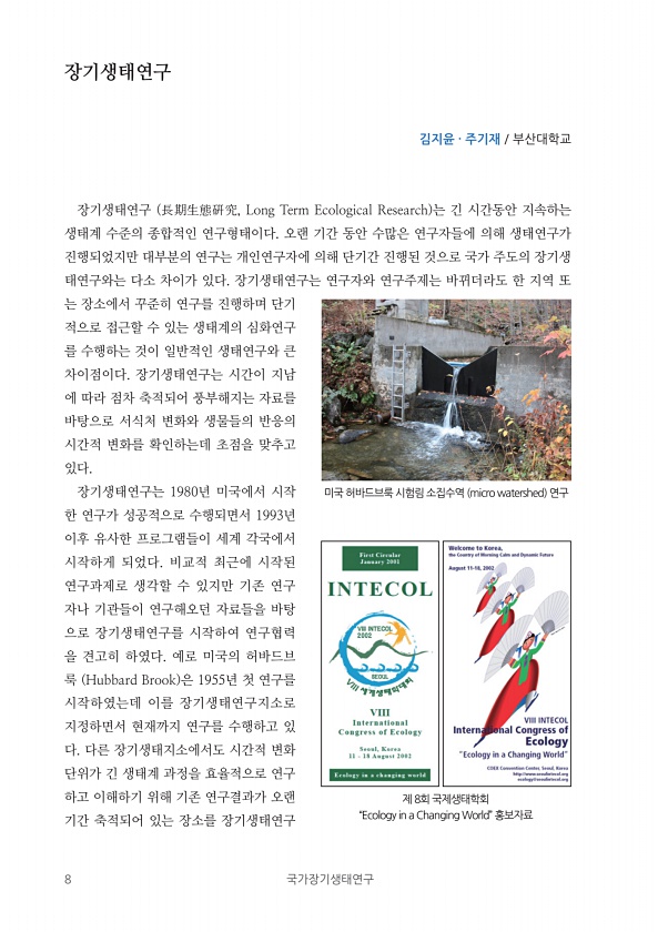 8 국가장기생태연구 장기생태연구 김지윤 · 주기재 부산대학교 장기생태연구 長期生態硏究, Long Term Ecological Research 는 긴 시간동안 지속하는 생태계 수준의 종합적인 연구형태이다. 오랜 기간 동안 수많은 연구자들에 의해 생태연구가 진행되었지만 대부분의 연구는 개인연구자에 의해 단기간 진행된 것으로 국가 주도의 장기생 태연구와는 다소 차이가 있다. 장기생태연구는 연구자와 연구주제는 바뀌더라도 한 지역 또 는 장소에서 꾸준히 연구를 진행하며 단기 적으로 접근할 수 있는 생태계의 심화연구 를 수행하는 것이 일반적인 생태연구와 큰 차이점이다. 장기생태연구는 시간이 지남 에 따라 점차 축적되어 풍부해지는 자료를 바탕으로 서식처 변화와 생물들의 반응의 시간적 변화를 확인하는데 초점을 맞추고 있다...