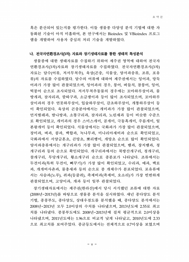 v 혹은 분산되어 있는지를 평가한다 이들 생물종 다양성 분석 기법에 대한 자 동화된 기술이 아직 미흡하여 본 연구에서는 및 프로그 램을 개발하여 사용자 중심의 처리 기술을 개발하였다 나 전국자연환경조사 차 자료와 장기생태자료를 통한 생태적 특성분석 생물종에 대한 생태자료를 수집하기 위하여 제주권 영역에 대하여 전국자 연환경조사 차 자료와 장기생태자료를 수집하였다 전국자연환경조사 차 자료는 담수 어류 저서무척추 육상 곤충 식물상 양서파충류 조류 포유 류 의 자료를 수집하였다 담수의 어류에 대하여 제주권에서는 잉어과 망둑 어과가 가장 많이 관찰되었으며 잉어과의 경우 붕어 버들치 참붕어 잉어 떡붕어 순으로 조사되었다 저서무척추동물의 경우에는 꼬마하루살이과 물 방개과 잠자리과 깔따구과 소금쟁이과 등이 많이 조사되었...