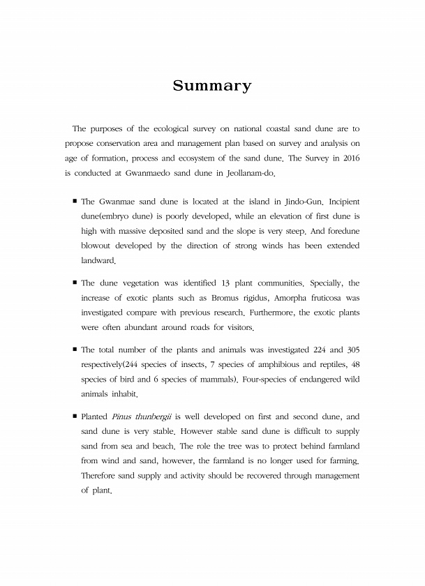 Summary The purposes of the ecological survey on national coastal sand dune are to propose conservation area and management plan based on survey and analysis on age of formation, process and ecosystem of the sand dune. The Survey in 2016 is conducted at Gwanmaedo sand dune in Jeollanam-do. ? The Gwanmae sand dune is located at the island in Jindo-Gun. Incipient dune embryo dune is poorly developed...