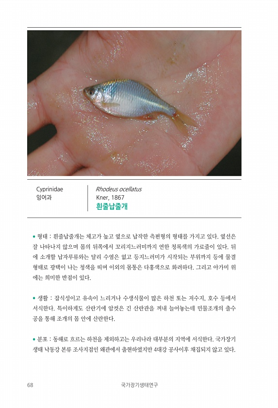 68 국가장기생태연구 ? 형태 흰줄납줄개는 체고가 높고 옆으로 납작한 측편형의 형태를 가지고 있다. 옆선은 잘 나타나지 않으며 몸의 뒤쪽에서 꼬리지느러미까지 연한 청록색의 가로줄이 있다. 뒤 에 소개할 납자루류와는 달리 수염은 없고 등지느러미가 시작되는 부위까지 등에 물결 형태로 광택이 나는 청색을 띠며 이외의 몸통은 다홍색으로 화려하다. 그리고 아가미 위 에는 희미한 반점이 있다. ? 생활 잡식성이고 유속이 느리거나 수생식물이 많은 하천 또는 저수지, 호수 등에서 서식한다. 특이하게도 산란기에 암컷은 긴 산란관을 꺼내 늘어놓는데 민물조개의 출수 공을 통해 조개의 몸 안에 산란한다. ? 분포 동해로 흐르는 하천을 제외하고는 우리나라 대부분의 지역에 서식한다. 국가장기 생태 낙동강 본류 조사지점인 왜관에서 출...