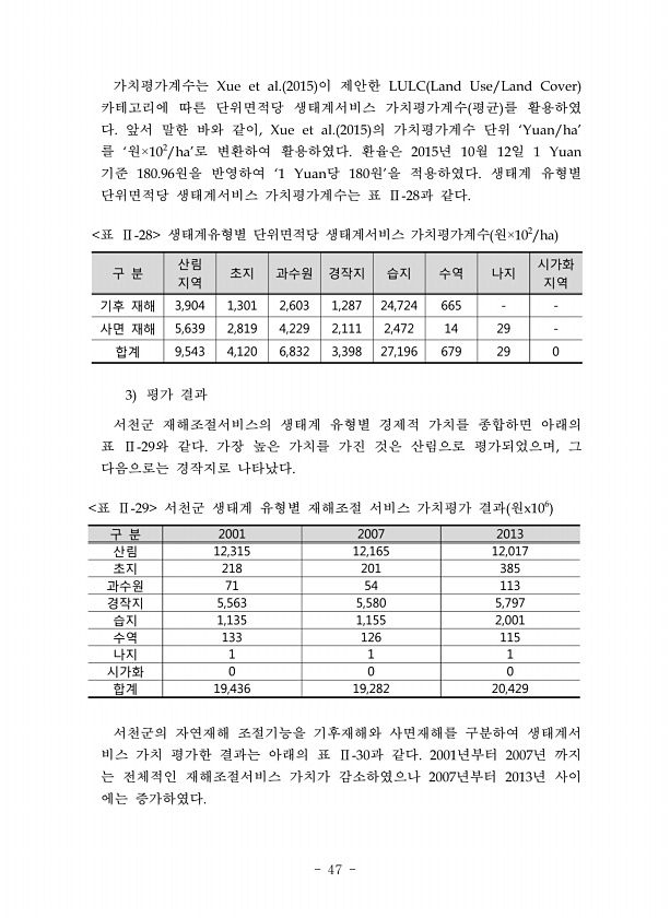 47 가치평가계수는 이 제안한 카테고리에 따른 단위면적당 생태계서비스 가치평가계수 평균 를 활용하였 다 앞서 말한 바와 같이 의 가치평가계수 단위 를 원 로 변환하여 활용하였다 환율은 년 월 일 기준 원을 반영하여 당 원 을 적용하였다 생태계 유형별 단위면적당 생태계서비스 가치평가계수는 표 과 같다 구 분 산림 지역 초지 과수원 경작지 습지 수역 나지 시가화 지역 기후 재해 3,904 1,301 2,603 1,287 24,724 665 사면 재해 5,639 2,819 4,229 2,111 2,472 14 29 합계 9,543 4,120 6,832 3,398 27,196 679 29 0 표 생태계유형별 단위면적당 생태계서비스 가치평가계수 원 평가 결과 서천군 재해조절서비스의 생태계 유형별 경제적 가치를 종합하...