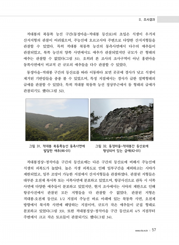 Ⅱ. 조사결과 www.nie.re.kr ? 57 적대봉의 북동쪽 능선 구간 동정마을적대봉 등산로 의 초입은 식생이 우거져 산지지형의 관찰이 어려웠으며, 주능선에 오르고서야 주변으로 다양한 산지지형들을 관찰할 수 있었다. 특히 적대봉 북동쪽 능선의 동측사면에서 다수의 애추들이 관찰되었고, 북쪽 능선의 양쪽 사면에서도 애추가 관찰되었지만 규모가 큰 형태의 애추는 관찰할 수 없었다 그림 31 오히려 본 조사의 조사구역이 아닌 홍련마을 동쪽사면에서 비교적 큰 규모의 애추들을 다수 관찰할 수 있었다. 동정마을적대봉 구간의 등산로를 따라 이동하다 보면 곳곳에 경사가 낮고 식생이 제거된 기반암들을 종종 볼 수 있었으며, 특정 지점에서는 경사가 급한 절벽형태의 급애를 관찰할 수 있었다. 특히 적대봉 북동쪽 능선 정상부근에...