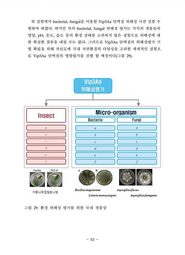 위 실험에서 bacterial, fungal을 이용한 Vip3Aa 단백질 위해성 사전 실험 수 행하여 하였다. 하지만 위의 bacterial, fungal 위해성 평가는 각각의 생물들의 영양, pH, 온도, 습도 등의 환경 상태를 고려하지 않은 실험으로 위해성에 대 한 확실한 결론을 내릴 수는 없다. 그러므로 Vip3Aa 단백질의 위해성평가 기 법 확립을 위해 차년도에 국내 자연환경의 다양성을 고려한 체계적인 실험으 로 Vip3Aa 단백질의 영향평가를 진행 할 예정이다 그림 29 그림 29. 환경 위해성 평가를 위한 국내생물상