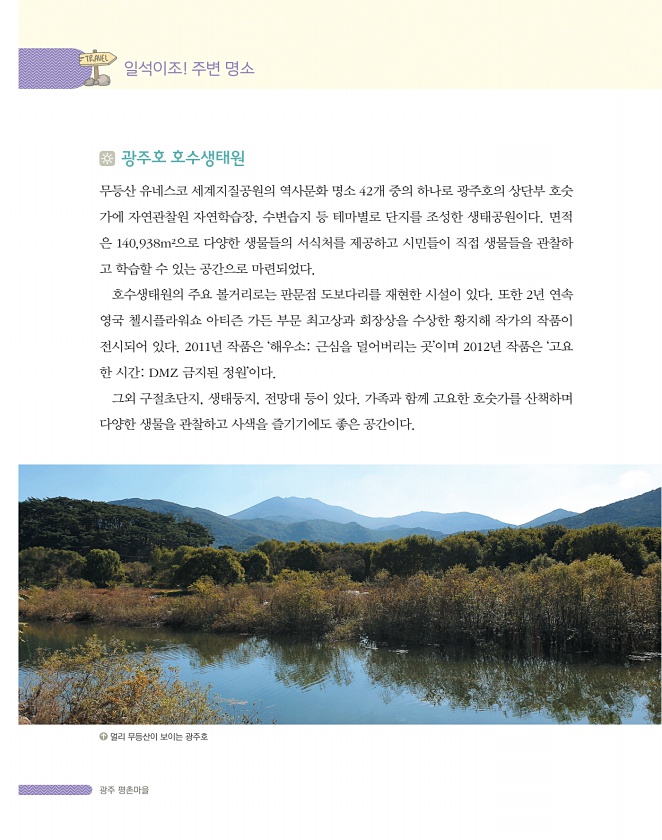 광주 평촌마을 광주호 호수생태원 무등산 유네스코 세계지질공원의 역사문화 명소 42개 중의 하나로 광주호의 상단부 호숫 가에 자연관찰원 자연학습장, 수변습지 등 테마별로 단지를 조성한 생태공원이다. 면적 은 140,938m2으로 다양한 생물들의 서식처를 제공하고 시민들이 직접 생물들을 관찰하 고 학습할 수 있는 공간으로 마련되었다. 호수생태원의 주요 볼거리로는 판문점 도보다리를 재현한 시설이 있다. 또한 2년 연속 영국 첼시플라워쇼 아티즌 가든 부문 최고상과 회장상을 수상한 황지해 작가의 작품이 전시되어 있다. 2011년 작품은 ‘해우소근심을 덜어버리는 곳’이며 2012년 작품은 ‘고요 한 시간DMZ 금지된 정원’이다. 그외 구절초단지, 생태둥지, 전망대 등이 있다. 가족과 함께 고요한 호숫가를 산책하며 다양...