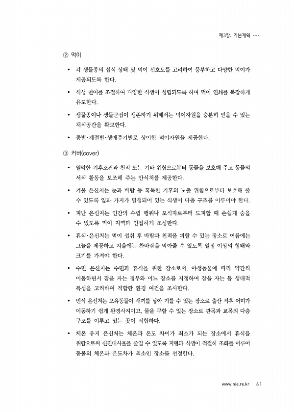 www.nie.re.kr 61 제3장. 기본계획 ② 먹이 각 생물종의 섭식 상태 및 먹이 선호도를 고려하여 풍부하고 다양한 먹이가 제공되도록 한다. 식생 천이를 조절하여 다양한 식생이 성립되도록 하며 먹이 연쇄를 복잡하게 유도한다. 생물종이나 생물군집이 생존하기 위해서는 먹이자원을 충분히 얻을 수 있는 채식공간을 확보한다. 종별?계절별?생애주기별로 상이한 먹이자원을 제공한다. ③ 커버 cover 열악한 기후조건과 천적 또는 기타 위험으로부터 동물을 보호해 주고 동물의 서식 활동을 보조해 주는 안식처를 제공한다. 겨울 은신처는 눈과 바람 등 혹독한 기후의 노출 위험으로부터 보호해 줄 수 있도록 잎과 가지가 밀생되어 있는 식생이 다층 구조를 이루어야 한다. 피난 은신처는 인간의 수렵 행위나 포식자로부터 도피할 ...