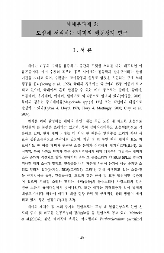 세세부과제 3도심에 서식하는 매미의 행동생태 연구 Ⅰ. 서 론 매미는 나무의 수액을 흡즙하며, 종간의 뚜렷한 소리를 내는 대표적인 여 름곤충이다. 매미 수컷의 복부와 흉부 사이에는 진동막과 발음근이라는 발성 기관을 지니고 있어, 수컷만이 교미활동의 일부로 암컷을 유인하는 구애 노래 행동을 한다 Young et al., 1995 국내의 경우에는 약 2아과 15종 여종이 보고 되고 있으며, 국내에서 흔히 발견할 수 있는 매미 종으로는 말매미, 참매미, 쓰름매미, 유지매미, 애매미, 털매미로 약 6종으로 알려져 있다 이영준, 2005 북미의 경우는 주기매미류 Magicicada spp. 가 13년 또는 17년마다 대량으로 발생하고 있다 Dybas & Lloyd, 1974; Flory & Mattingly, 200...