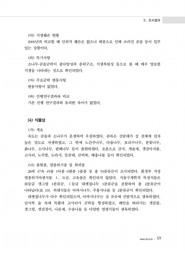 Ⅱ. 조사결과 www.nie.re.kr ? 59 다 식생훼손 현황 2006년과 비교할 때 인위적 훼손은 없으나 태풍으로 인해 쓰러진 곰솔 등이 일부 있는 상황이다. 라 특기사항 소나무-곰솔군락이 종다양성과 층위구조, 식생복원성 등으로 볼 때 매우 양호한 식생을 나타내는 것으로 확인되었다. 마 주요군락 변동사항 변동사항이 없었다. 바 선행연구결과와 비교 기존 선행 연구결과와 유의한 차이가 없었다. 4 식물상 가 개요 옥도는 곰솔과 소나무가 혼생하며 우점하였다. 관목은 진달래가 섬 전체에 걸쳐 높은 밀도로 자생하였고, 그 밖에 노간주나무, 다릅나무, 보리수나무, 분꽃나무, 붉나무, 소사나무, 팥배나무 등이 출현하였다. 초본으로 감국, 개솔새, 갯강아지풀, 고사리, 노루발, 도라지, 둥굴레, 큰비쑥, 해홍나물 등...