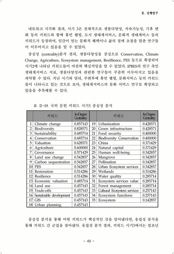 Ⅱ. 선행연구 49 네트워크 시각화 결과, 시기 3은 전체적으로 생물다양성, 지속가능성, 기후 변 화 등의 키워드와 함께 휴먼 웰빙, 도시 생태계서비스, 문화적 생태계비스 등의 키워드가 등장하여, 인간이 얻는 문화적 혜택이나 삶의 질에 초점을 맞춘 연구들 이 이루어지고 있음을 알 수 있었다. 중심성 centrality 분석 결과, 생물다양성을 중심으로 Conservation, Climate Change, Agriculture, Ecosystem management, Resillience, PES 등으로 확장되어 시기2에 나타난 키워드들이 여전히 핵심적임을 알 수 있었다. IPBES의 연구 축인 생태계서비스 지표, 생물다양성과 관련한 연구들이 꾸준히 이루어지고 있음을 파악할 수 있다. 지난 시기와 달리, 주변...