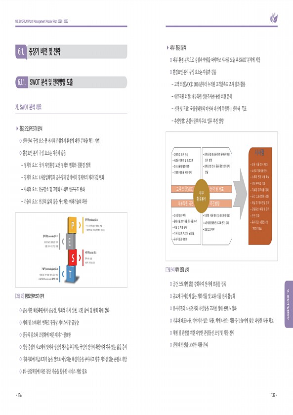 6.1. 중장기 비전 및 전략 6.1.1. SWOT 분석 및 전략방향 도출 가. SWOT 분석 개요 ▶ 환경요인 PEST 분석 ?? 전략관리 구성 요소 중 거시적 관점에서 환경에 대한 분석을 하는 기법 ?? 환경요인 분석 구성 요소는 다음과 같음 정치적 요소국가 자연환경 보전 정책의 변화와 친환경 정책 경제적 요소4차산업혁명과 공유경제 및 데이터 경제로의 패러다임 변화 사회적 요소인구감소 및 고령화 사회로 인구구조 변화 기술적 요소인간의 삶의 질을 개선하는 미래기술의 확산 [그림 93] 환경요인 PEST 분석 ?? 공공기관 혁신측면에서 공공성, 사회적 가치 실현, 국민 참여 및 협력 확대 강화 ?? 세대 및 소비패턴 변화로 동영상 서비스시장 급상승 ?? 인구의 감소와 고령화에 따른 대비가 필요함 ?? 성장 ...