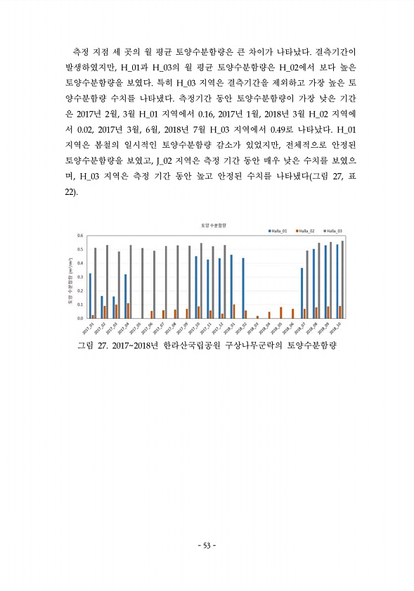 53 측정 지점 세 곳의 월 평균 토양수분함량은 큰 차이가 나타났다. 결측기간이 발생하였지만, H_01과 H_03의 월 평균 토양수분함량은 H_02에서 보다 높은 토양수분함량을 보였다. 특히 H_03 지역은 결측기간을 제외하고 가장 높은 토 양수분함량 수치를 나타냈다. 측정기간 동안 토양수분함량이 가장 낮은 기간 은 2017년 2월, 3월 H_01 지역에서 0.16, 2017년 1월, 201P년 3월 H_02 지역에 서 0.02, 2017년 3월, 6월, 201P년 7월 H_03 지역에서 0.UW로 나타났다. H_01 지역은 봄철의 일시적인 토양수분함량 감소가 있었지만, 전체적으로 안정된 토양수분함량을 보였고, J_02 지역은 측정 기간 동안 매우 낮은 수치를 보였으 며, H_03 지역은 측정 기간 동안 높...