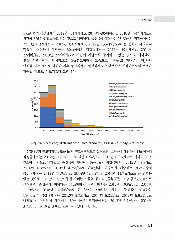 Ⅱ. 조사결과 www.nie.re.kr ? 61 15㎝이하의 직경급에서 2012년 401개체/ha, 2014년 406개체/ha, 2018년 374개체/ha로 시간이 지날수록 감소하고 있는 것으로 나타났다. 중경목에 해당하는 15-30㎝의 직경급에서는 2012년 153개체/ha, 2014년 156개체/ha, 2018년 155개체/ha로 큰 변화가 나타나지 않았다. 대경목에 해당하는 30㎝이상의 직경급에서는 2012년 19개체/ha, 2014년 22개체/ha, 2018년 27개체/ha로 시간이 지날수록 증가하고 있는 것으로 나타났다. 신갈나무의 경우, 전체적으로 정규분포형태의 모습으로 나타났고 피나무는 역J자의 형태를 띄는 것으로 나타나 차후 종간경쟁이 발생하겠지만 당분간은 신갈나무림의 우세가 지속될 것으로 사...