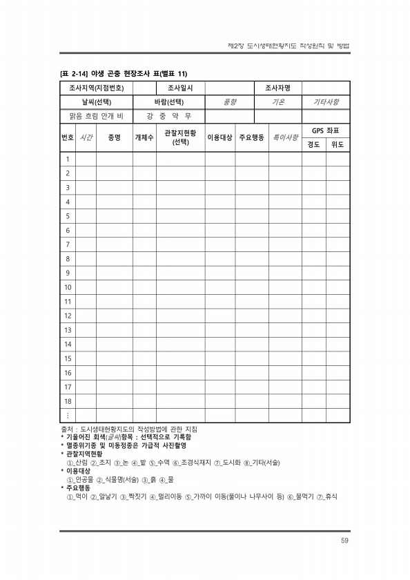 제2장 도시생태현황지도 작성원칙 및 방법 59 조사지역 지점번호 조사일시 조사자명 날씨 선택 바람 선택 풍향 기온 기타사항 맑음 흐림 안개 비 강 중 약 무 번호 시간 종명 개체수 관찰지현황 선택 이용대상 주요행동 특이사항 GPS 좌표 경도 위도 1 2 3 4 5 6 7 8 9 10 11 12 13 14 15 16 17 18 ? 출처 도시생태현황지도의 작성방법에 관한 지침 * 기울어진 회색 글씨 항목 선택적으로 기록함 * 멸종위기종 및 미동정종은 가급적 사진촬영 * 관찰지역현황 ①_산림 ②_초지 ③_논 ④_밭 ⑤_수역 ⑥_조경식재지 ⑦_도시화 ⑧_기타 서술 * 이용대상 ①_인공물 ②_식물명 서술 ③_흙 ④_물 * 주요행동 ①_먹이 ②_알낳기 ③_짝짓기 ④_멀리이동 ⑤_가까이 이동 풀이나 나무사이 등 ⑥_물먹...
