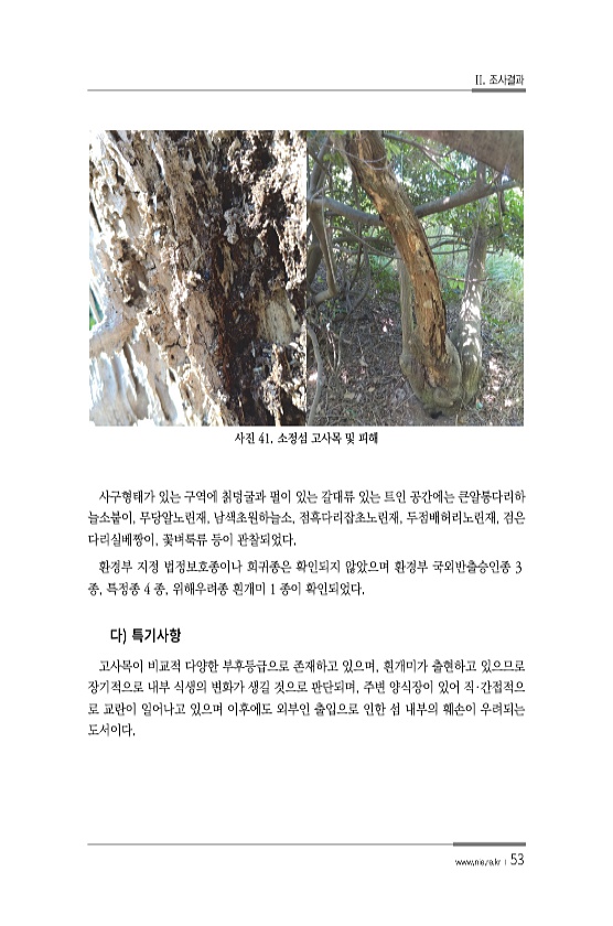 II. 조사결과 www.nie.re.kr ? 53 사진 41. 소정섬 고사목 및 피해 사구형태가 있는 구역에 칡덩굴과 펄이 있는 갈대류 있는 트인 공간에는 큰알통다리하 늘소붙이, 무당알노린재, 남색초원하늘소, 점흑다리잡초노린재, 두점배허리노린재, 검은 다리실베짱이, 꽃벼룩류 등이 관찰되었다. 환경부 지정 법정보호종이나 희귀종은 확인되지 않았으며 환경부 국외반출승인종 3 종, 특정종 4 종, 위해우려종 흰개미 1 종이 확인되었다. 고사목이 비교적 다양한 부후등급으로 존재하고 있으며, 흰개미가 출현하고 있으므로 장기적으로 내부 식생의 변화가 생길 것으로 판단되며, 주변 양식장이 있어 직·간접적으 로 교란이 일어나고 있으며 이후에도 외부인 출입으로 인한 섬 내부의 훼손이 우려되는도서이다.