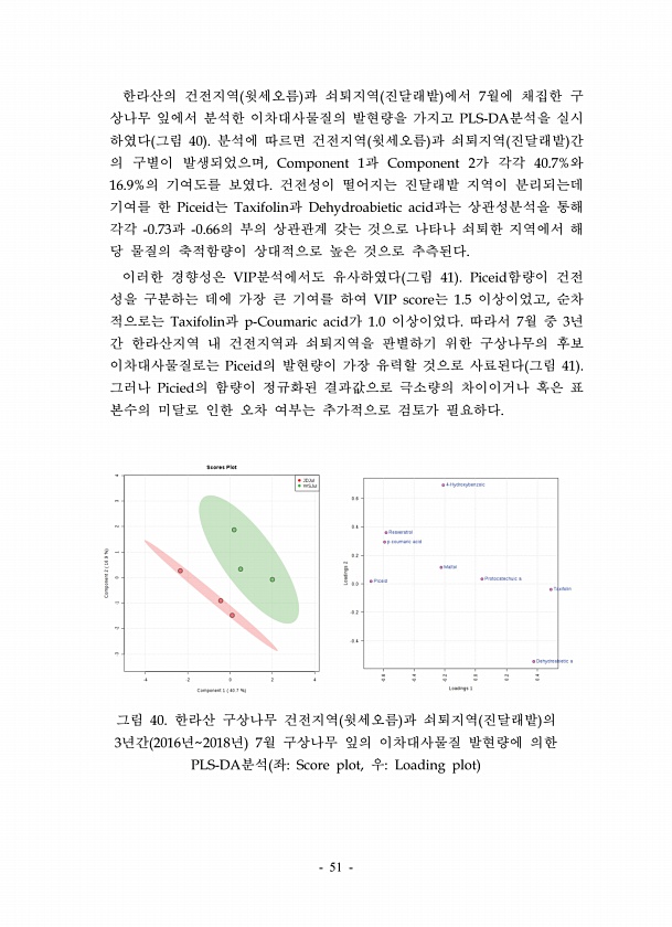 51 한라산의 건전지역 윗세오름 과 쇠퇴지역 진달래밭 에서 7월에 채집한 구 상나무 잎에서 분석한 이차대사물질의 발현량을 가지고 PLS-DA분석을 실시 하였다 그림 40 분석에 따르면 건전지역 윗세오름 과 쇠퇴지역 진달래밭 간 의 구별이 발생되었으며, Component 1과 Component 2가 각각 40.7%와 16.9%의 기여도를 보였다. 건전성이 떨어지는 진달래밭 지역이 분리되는데 기여를 한 Piceid는 Taxifolin과 Dehydroabietic acid과는 상관성분석을 통해 각각 -0.73과 -0.66의 부의 상관관계 갖는 것으로 나타나 쇠퇴한 지역에서 해 당 물질의 축적함량이 상대적으로 높은 것으로 추측된다. 이러한 경향성은 VIP분석에서도 유사하였다 그림 41 Piceid함량이 건전 성을 ...