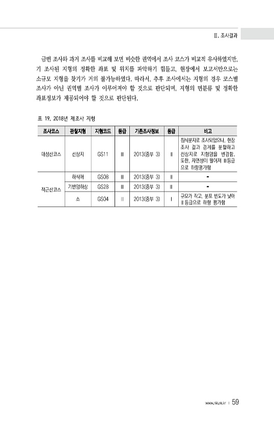 Ⅱ. 조사결과 www.nie.re.kr ? 59 금번 조사와 과거 조사를 비교해 보면 비슷한 권역에서 조사 코스가 비교적 유사하였지만, 기 조사된 지형의 정확한 좌표 및 위치를 파악하기 힘들고, 현장에서 보고서만으로는 소규모 지형을 찾기가 거의 불가능하였다. 따라서, 추후 조사에서는 지형의 경우 코스별 조사가 아닌 권역별 조사가 이루어져야 할 것으로 판단되며, 지형의 면분류 및 정확한 좌표정보가 제공되어야 할 것으로 판단된다. 조사코스 관찰지형 지형코드 등급 기존조사정보 등급 비고 대성산코스 선상지 GS11 Ⅲ 2013 중부 3 Ⅱ 침식분지로 조사되었으나, 현장 조사 결과 경계를 분할하고 선상지로 지형명을 변경함. 또한, 자연성이 떨어져 Ⅲ등급 으로 하향평가함 적근산코스 하식애 GS08 Ⅲ 2013 중부 3...