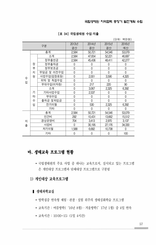 국립생태원 지역협력 중장기 발전계획 수립 57 [표 34] 국립생태원 수입·지출 단위백만원 구분 2013년 결산 2014년 결산 2015년 결산 2016년 예산 수 입 총계 2,584 50,721 54,546 53,079 정 부 지 원 소계 2,584 47,654 52,221 46,687 정부출연금 2,584 45,436 48,411 42,277 정부출자금 0 0 0 0 정부보조금 0 0 0 0 부담금 및 이전수입 0 0 0 0 사업수입 입장료등 0 2,001 3,590 4,320 위탁 및 독점수입 0 0 0 0 부대수입 이자등 0 217 220 90 기 타 수 입 소계 0 3,067 2,325 6,392 기타사업수입 0 2,537 0 0 부대수입 0 0 0 0 출자금 및차입금 0 0 0 0 전기이월 0 5...