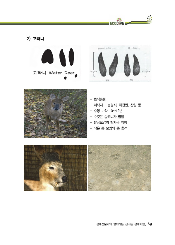 생태전문가와 함께하는 신나는 생태체험_ 69 2 고라니 초식동물 서식지 농경지, 하천변, 산림 등 수명 약 1012년 수컷은 송곳니가 발달 발굽모양의 발자국 찍힘 작은 콩 모양의 똥흔적