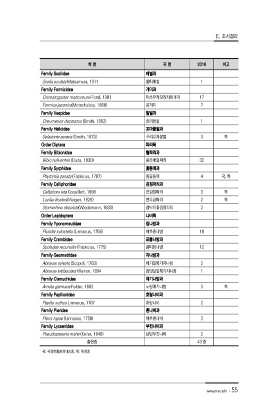 II. 조사결과 www.nie.re.kr ? 55 학 명 국 명 2018 비고 Family Scoliidae 배벌과 Scolia oculata Matsumura, 1911 황띠배벌 1 Family Formicidae 개미과 Crematogaster matsumurai Forel, 1901 마쓰무라꼬리치레개미 17 Formica japonica Motschulsky, 1866 곰개미 7 Family Vespidae 말벌과 Oreumenes decoratus Smith, 1852 호리병벌 1 Family Halicidae 꼬마꽃벌과 Seladonia aeraria Smith, 1873 구리꼬마꽃벌 3 특 Order Diptera 파리목 Family Bibionidae 털파리과 Bibio rufiventris D...