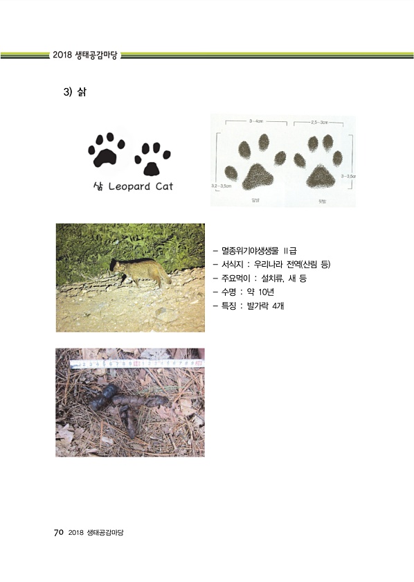 70 2018 생태공감마당 3 삵 멸종위기야생생물 Ⅱ급 서식지 우리나라 전역 산림 등 주요먹이 설치류, 새 등 수명 약 10년 특징 발가락4개