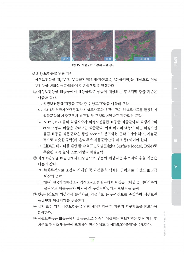 71 제5차 전국자연환경조사 지침 그림 15. 식물군락의?경계?구분?갱신 ?.?.? 보전등급?변화?파악 식생보전등급 Ⅲ, Ⅳ 및 Ⅴ등급지역 생태·자연도 ?, ?등급지역 을?대상으로?식생 보전등급?변화상을?파악하여?현존식생도를?갱신한다. ① 식생보전등급 Ⅲ등급에서 Ⅱ등급으로?상승이?예상되는?후보지역?추출?기준은 다음과?같다. ?. 식생보전등급 Ⅲ등급?군락?중?임상도 Ⅳ영급?이상의?군락 ?. 제?·?차?전국자연환경조사?식생조사표와?유관기관의?식생조사표를?활용하여 식물군락의?계층구조가?비교적?잘?구성되어있다고?판단되는?군락 ?. NDVI, EVI 등의?식생지수가?식생보전등급 Ⅱ등급?식물군락의?식생지수의 ??% 이상의?비율을?나타내는?식물군락. 이때?비교의?대상이?되는?식생보전 등급 Ⅱ등급?식물군락은?동일 scen...