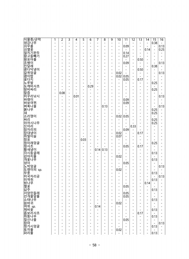 58 식물종/군락 1 2 3 4 5 6 7 8 9 10 11 12 13 14 15 16 생강나무 0.38 쇠무릎 0.09 0.13 쇠별꽃 0.14 0.25 얼치기완두 0.14 왕고들빼기 0.27 왕포아풀 0.50 조뱅이 0.09 0.13 진달래 0.38 콩다닥냉이 0.50 갈퀴덩굴 0.02 0.13 괭이밥 0.02 0.05 꽃다지 0.05 0.17 노루발 0.25 도깨비사초 0.29 땅비싸리 0.25 말즘 0.08 미꾸리낚시 0.01 0.13 바랭이 0.09 바보여뀌 0.09 벼룩나물 0.13 0.13 붉나무 0.25 새 0.25 소리쟁이 0.02 0.05 싸리 0.25 아까시나무 0.25 으아리 0.33 잠자리피 0.09 장대냉이 0.02 0.17 쥐털이슬 0.07 창포 0.03 청미래덩굴 0.25 청사초...