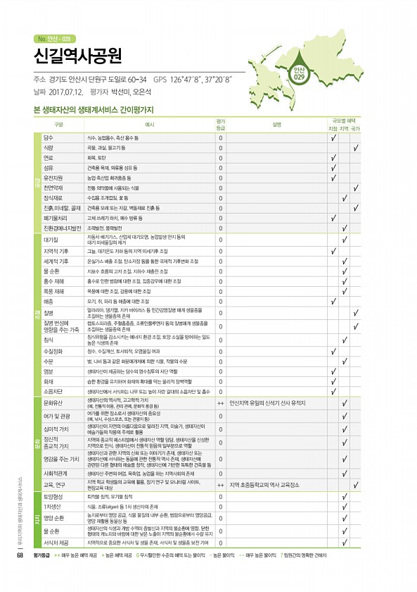 No. 안산 안산 029 본 생태자산의 생태계서비스 간이평가지 구분 예시 평가 등급 설명 규모별 혜택 지점 지역 국가 공급 담수 식수, 농업용수, 축산 용수 등 0 √ 식량 곡물, 과실, 물고기 등 0 √ 연료 화목, 토탄 0 √ 섬유 건축용 목재, 의류용 섬유 등 0 √ 유전자원 농업·축산업 희귀품종 등 0 √ 천연약재 전통 의약품에 사용되는 식물 0 √ 장식재료 수집용 조개껍질, 꽃 등 0 √ 진흙,미네랄, 골재 건축용 모래 또는 자갈, 벽돌재료 진흙 등 0 √ 폐기물처리 고체 쓰레기 하치, 폐수 방류 등 0 √ 친환경에너지발전 조력발전, 풍력발전 0 √ 조절 대기질 자동차 배기가스, 산업체 대기오염, 농업발생 먼지 등의 대기 미세물질의 제거 0 √ 지역적 기후 그늘, 대기온도 저하 등의 지역 미세기후 ...