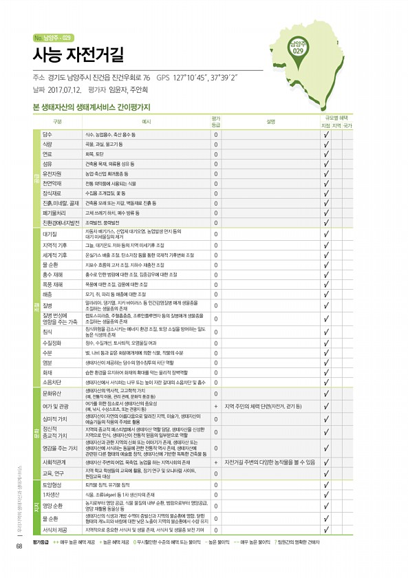 No. 남양주 남양주 029 본 생태자산의 생태계서비스 간이평가지 구분 예시 평가 등급 설명 규모별 혜택 지점 지역 국가 공급 담수 식수, 농업용수, 축산 용수 등 0 √ 식량 곡물, 과실, 물고기 등 0 √ 연료 화목, 토탄 0 √ 섬유 건축용 목재, 의류용 섬유 등 0 √ 유전자원 농업·축산업 희귀품종 등 0 √ 천연약재 전통 의약품에 사용되는 식물 0 √ 장식재료 수집용 조개껍질, 꽃 등 0 √ 진흙,미네랄, 골재 건축용 모래 또는 자갈, 벽돌재료 진흙 등 0 √ 폐기물처리 고체 쓰레기 하치, 폐수 방류 등 0 √ 친환경에너지발전 조력발전, 풍력발전 0 √ 조절 대기질 자동차 배기가스, 산업체 대기오염, 농업발생 먼지 등의 대기 미세물질의 제거 0 √ 지역적 기후 그늘, 대기온도 저하 등의 지역 미세기...