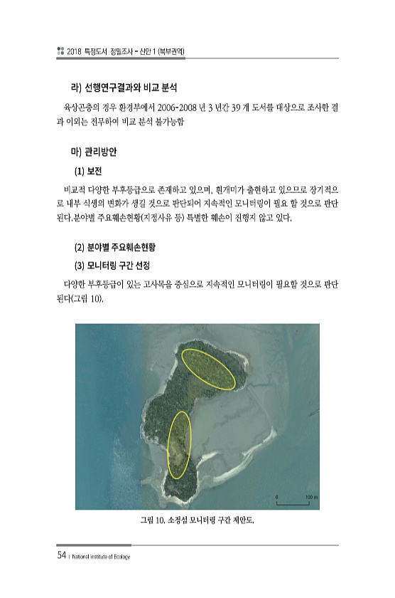 2018 특정도서 정밀조사 신안 1 북부권역 54 ? National Institute of Ecology 육상곤충의 경우 환경부에서 2006-2008 년 3 년간 39 개 도서를 대상으로 조사한 결 과 이외는 전무하여 비교 분석 불가능함 1 비교적 다양한 부후등급으로 존재하고 있으며, 흰개미가 출현하고 있으므로 장기적으 로 내부 식생의 변화가 생길 것으로 판단되어 지속적인 모니터링이 필요 할 것으로 판단 된다.분야별 주요훼손현황 지정사유 등 특별한 훼손이 진행지 않고 있다. 2 3 다양한 부후등급이 있는 고사목을 중심으로 지속적인 모니터링이 필요할 것으로 판단 된다 그림 10 그림 10. 소정섬 모니터링 구간제안도.
