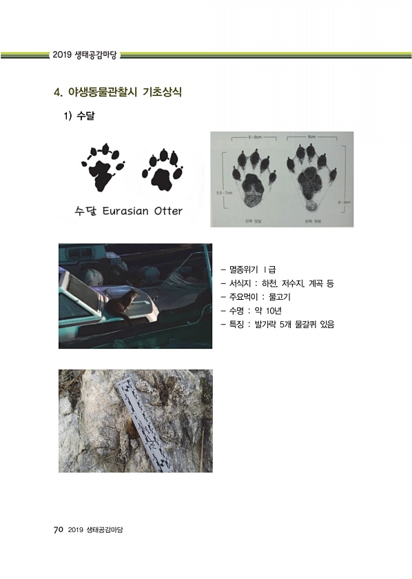 70 2019 생태공감마당 4. 야생동물관찰시 기초상식 1 수달 멸종위기 Ⅰ급 서식지 하천, 저수지, 계곡 등 주요먹이 물고기 수명 약 10년 특징 발가락 5개 물갈퀴있음