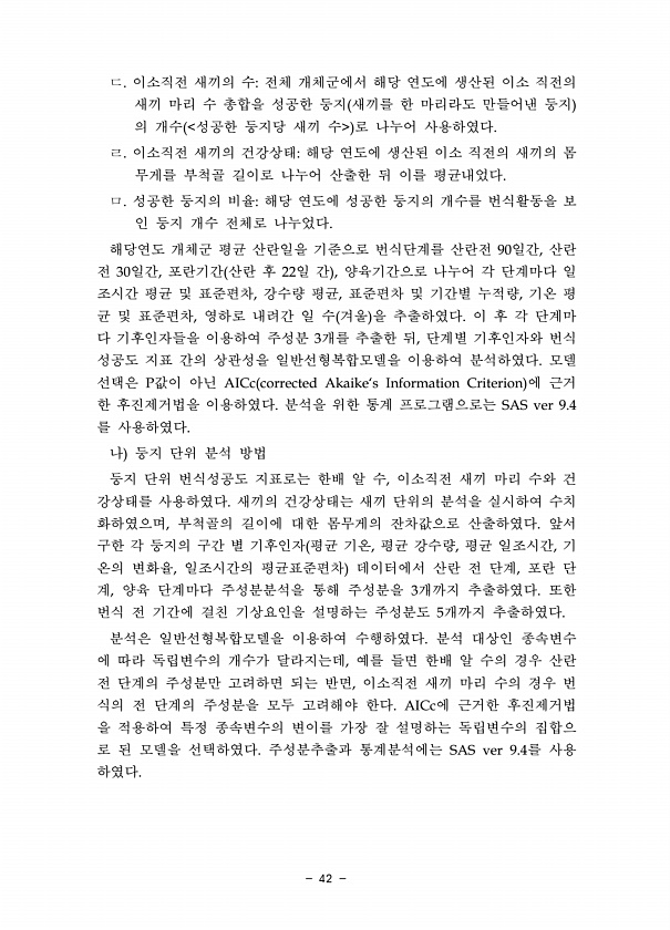 42 ㄷ. 이소직전 새끼의 수전체 개체군에서 해당 연도에 생산된 이소 직전의 새끼 마리 수 총합을 성공한 둥지 새끼를 한 마리라도 만들어낸 둥지 의 개수 성공한 둥지당 새끼 수 로 나누어 사용하였다. ㄹ. 이소직전 새끼의 건강상태해당 연도에 생산된 이소 직전의 새끼의 몸 무게를 부척골 길이로 나누어 산출한 뒤 이를 평균내었다. ㅁ. 성공한 둥지의 비율해당 연도에 성공한 둥지의 개수를 번식활동을 보 인 둥지 개수 전체로 나누었다. 해당연도 개체군 평균 산란일을 기준으로 번식단계를 산란전 90일간, 산란 전 30일간, 포란기간 산란 후 22일 간 , 양육기간으로 나누어 각 단계마다 일 조시간 평균 및 표준편차, 강수량 평균, 표준편차 및 기간별 누적량, 기온 평 균 및 표준편차, 영하로 내려간 일 수 겨울 을 ...