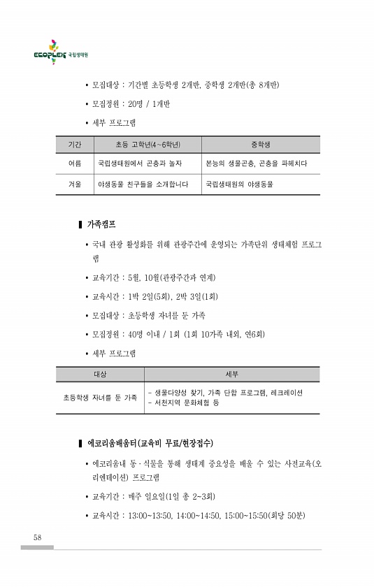 58 ? 모집대상 기간별 초등학생 2개반, 중학생 2개반 총 8개반 ? 모집정원 20명 1개반 ? 세부 프로그램 기간 초등 고학년 4∼6학년 중학생 여름 국립생태원에서 곤충과 놀자 본능의 생물곤충, 곤충을 파헤치다 겨울 야생동물 친구들을 소개합니다 국립생태원의 야생동물 ? 가족캠프 ? 국내 관광 활성화를 위해 관광주간에 운영되는 가족단위 생태체험 프로그 램 ? 교육기간 5월, 10월 관광주간과 연계 ? 교육시간 1박 2일 5회 , 2박 3일 1회 ? 모집대상 초등학생 자녀를 둔 가족 ? 모집정원 40명 이내 1회 1회 10가족 내외, 연6회 ? 세부 프로그램 대상 세부 초등학생 자녀를 둔 가족 생물다양성 찾기, 가족 단합 프로그램, 레크레이션 서천지역 문화체험 등 ? 에코리움배움터 교육비 무료/현장접수 ? ...