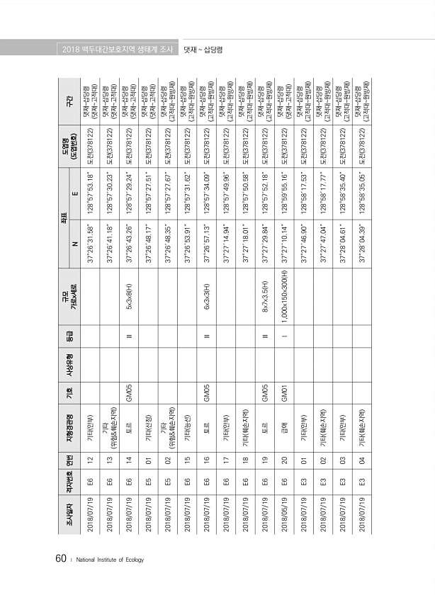 60 ? National Institute of Ecology 조사일자 격자번호 연번 지형경관명 기호 사상유형 등급 규모 가로x세로 좌표 도엽명 N E 도엽번호 구간 2018/07/19 E6 12 기타 안부 37°26′31.58″ 128°57′53.18″ 도전 378122 댓재삽당령 댓재고적대 2018/07/19 E6 13 기타 위험&훼손지역 37°26′41.18″ 128°57′30.23″ 도전 378122 댓재고적대 댓재삽당령 2018/07/19 E6 14 토르 GM05 Ⅲ 5x3x8 H 37°26′43.26″ 128°57′29.24″ 도전 378122 댓재삽당령 댓재고적대 2018/07/19 E5 01 기타 산정 37°26′48.17″ 128°57′27.51″ 도전 378122 댓재삽당령 댓재고적대 20...