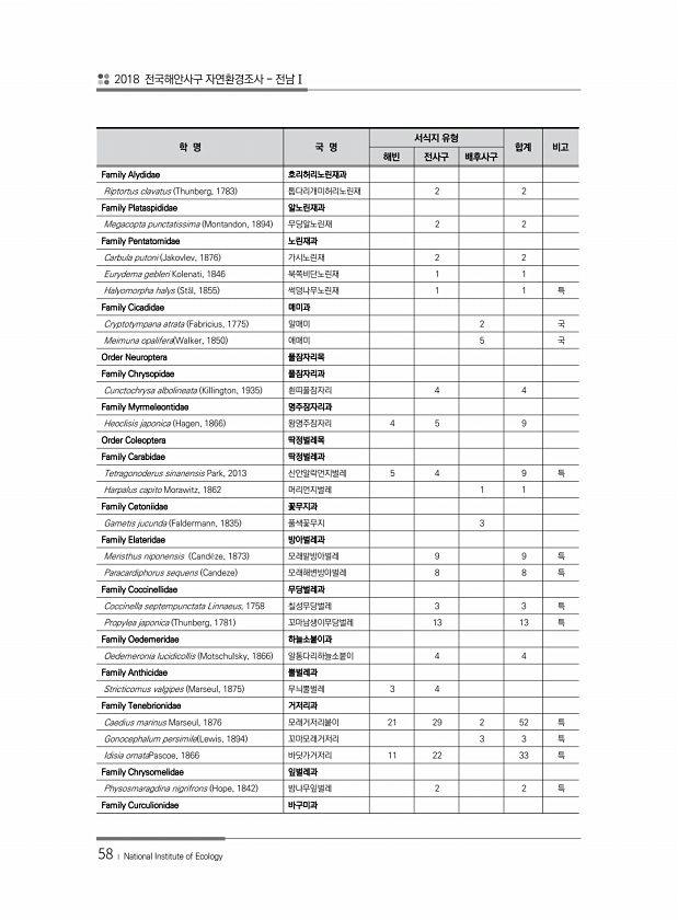2018 전국해안사구 자연환경조사 전남Ⅰ 58 ? National Institute of Ecology 학 명 국 명 서식지 유형 합계 비고 해빈 전사구 배후사구 Family Alydidae 호리허리노린재과 Riptortus clavatus Thunberg, 1783 톱다리개미허리노린재 2 2 Family Plataspididae 알노린재과 Megacopta punctatissima Montandon, 1894 무당알노린재 2 2 Family Pentatomidae 노린재과 Carbula putoni Jakovlev, 1876 가시노린재 2 2 Eurydema gebleri Kolenati, 1846 북쪽비단노린재 1 1 Halyomorpha halys St?l, 1855 썩덩나무노린재 1 1 특 Famil...