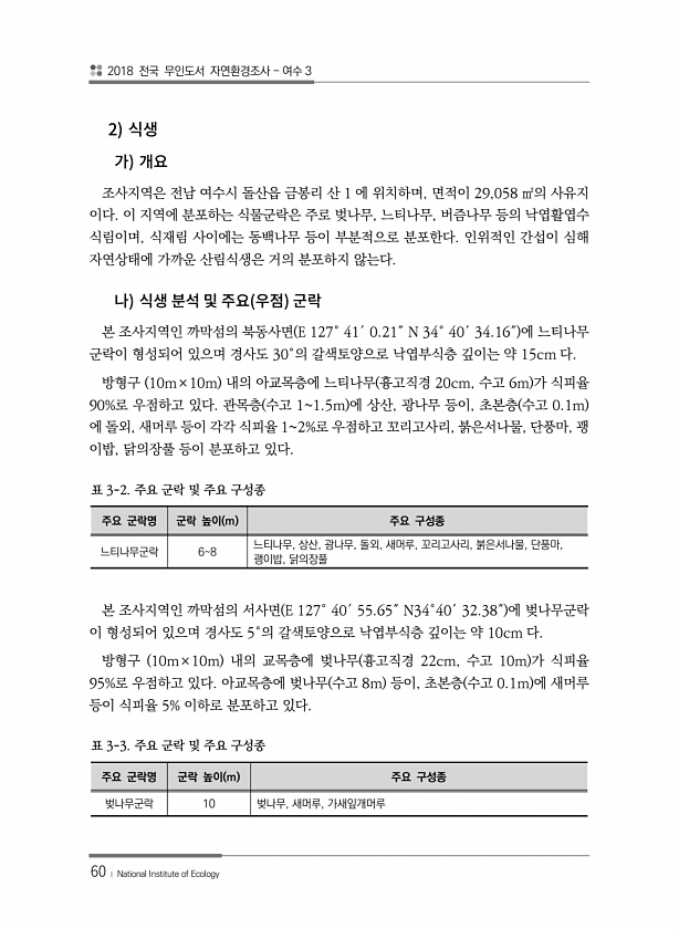 2018 전국 무인도서 자연환경조사 여수 3 60 ? National Institute of Ecology 2 조사지역은 전남 여수시 돌산읍 금봉리 산 1 에 위치하며, 면적이 29,058 ㎡의 사유지 이다. 이 지역에 분포하는 식물군락은 주로 벚나무, 느티나무, 버즘나무 등의 낙엽활엽수 식림이며, 식재림 사이에는 동백나무 등이 부분적으로 분포한다. 인위적인 간섭이 심해 자연상태에 가까운 산림식생은 거의 분포하지 않는다. 본 조사지역인 까막섬의 북동사면 E 127° 41′ 0.21″ N 34° 40′ 34.16″ 에 느티나무 군락이 형성되어 있으며 경사도 30°의 갈색토양으로 낙엽부식층 깊이는 약 15cm 다. 방형구 10m×10m 내의 아교목층에 느티나무 흉고직경 20cm, 수고 6m 가 식피율 90%로 ...