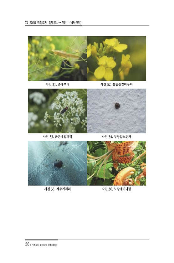 2018 특정도서 정밀조사 신안 1 남부권역 56 ? National Institute of Ecology 사진 31. 좀매부리 사진 32. 유럽좁쌀바구미 사진 33. 붉은배털파리 사진 34. 무당알노린재 사진 35. 제주거저리 사진 36.노랑애기나방