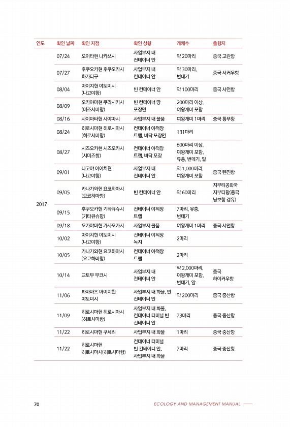 70 ECOLOGY AND MANAGEMENT MANUAL 연도 확인 날짜 확인 지점 확인 상황 개체수 출항지 2017 07/24 오이타현 나카쓰시 사업부지 내 컨테이너 안 약 20마리 중국 고란항 07/27 후쿠오카현 후쿠오카시 하카타구 사업부지 내 컨테이너 안 약 30마리, 번데기 중국 서커우항 08/04 아이치현 야토미시 나고야항 빈 컨테이너 안 약 100마리 중국 샤먼항 08/09 오카야마현 쿠라시키시 미즈시마항 빈 컨테이너 땅 포장면 200마리 이상, 여왕개미 포함 08/16 사이마타현 사야마시 사업부지 내 물품 여왕개미 1마리 중국 황푸항 08/24 히로시마현 히로시마시 히로시마항 컨테이너 야적장 트랩, 바닥 포장면 131마리 08/27 시즈오카현 시즈오카시 시미즈항 컨테이너 야적장 트랩, 바닥 ...