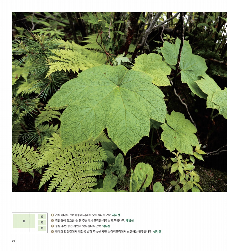 ??? ? ? 가문비나무군락 하층에 자리한 땃두릅나무군락. 지리산 ? 광환경이 양호한 숲 틈 주변에서 군락을 이루는 땃두릅나무. 계방산 ? 중봉 주변 능선 사면의 땃두릅나무군락. 덕유산 ? 한계령 갈림길에서 대청봉 방향 주능선 사면 눈측백군락에서 산생하는 땃두릅나무. 설악산70