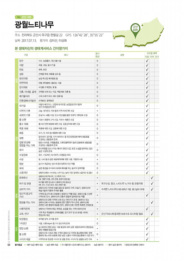 No. 군산- 군산 029 본 생태자산의 생태계서비스 간이평가지 구분 예시 평가 등급 설명 규모별 혜택 지점 지역 국가 공급 담수 식수, 농업용수, 축산 용수 등 0 √ 식량 곡물, 과실, 물고기 등 0 √ 연료 화목, 토탄 0 √ 섬유 건축용 목재, 의류용 섬유 등 0 √ 유전자원 농업·축산업 희귀품종 등 0 √ 천연약재 전통 의약품에 사용되는 식물 0 √ 장식재료 수집용 조개껍질, 꽃 등 0 √ 진흙, 미네랄, 골재 건축용 모래 또는 자갈, 벽돌재료 진흙 등 0 √ 폐기물처리 고체 쓰레기 하치, 폐수 방류 등 0 √ 친환경에너지발전 조력발전, 풍력발전 0 √ 조절 대기질 자동차 배기가스, 산업체 대기오염, 농업발생 먼지 등의 대기 미세물질의 제거 0 √ 지역적 기후 그늘, 대기온도 저하 등의 지역 미세기...