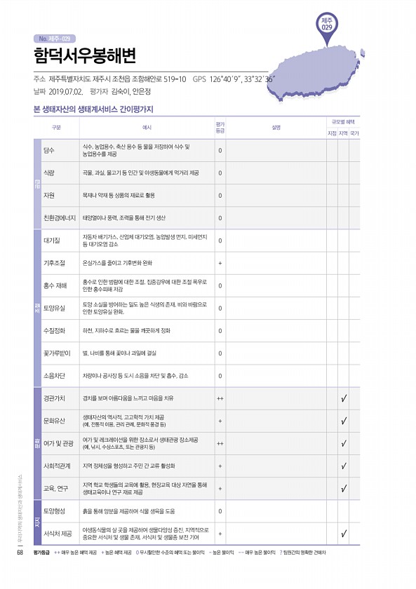 No. 제주- 제주 029 본 생태자산의 생태계서비스 간이평가지 구분 예시 평가 등급 설명 규모별 혜택 지점 지역 국가 공급 담수 식수, 농업용수, 축산 용수 등 물을 저장하여 식수 및 농업용수를 제공 0 식량 곡물, 과실, 물고기 등 인간 및 야생동물에게 먹거리 제공 0 자원 목재나 약재 등 상품의 재료로 활용 0 친환경에너지 태양열이나 풍력, 조력을 통해 전기 생산 0 조절 대기질 자동차 배기가스, 산업체 대기오염, 농업발생 먼지, 미세먼지 등 대기오염 감소 0 기후조절 온실가스를 줄이고 기후변화 완화 + 홍수 재해 홍수로 인한 범람에 대한 조절, 집중강우에 대한 조절 폭우로 인한 홍수피해 저감 0 토양유실 토양 소실을 방어하는 밀도 높은 식생의 존재, 비와 바람으로 인한 토양유실 완화, 0 수질정화 하...