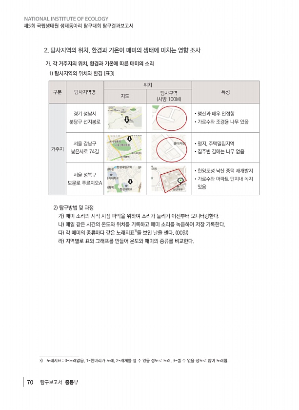 70 탐구보고서 중등부 제5회 국립생태원 생태동아리 탐구대회 탐구결과보고서 2. 탐사지역의 위치, 환경과 기온이 매미의 생태에 미치는 영향 조사 가. 각 거주지의 위치, 환경과 기온에 따른 매미의 소리 1 탐사지역의 위치와 환경 [표3] 구분 탐사지역명 위치 특성 지도 탐사구역 사방 100M 거주지 경기 성남시 분당구 선지봉로 ?맹산과 매우 인접함 ?가로수와 조경용 나무 있음 서울 강남구 봉은사로 74길 ?평지, 주택밀집지역 ?집주변 길에는 나무 없음 서울 성북구 보문로 푸르지오A ?한양도성 낙산 중턱 재개발지 ?가로수와 아파트 단지내 녹지 있음 2 탐구방법 및 과정 가 매미 소리의 시작 시점 파악을 위하여 소리가 들리기 이전부터 모니터링한다. 나 매일 같은 시간의 온도와 위치를 기록하고 매미 소리를 녹음하...