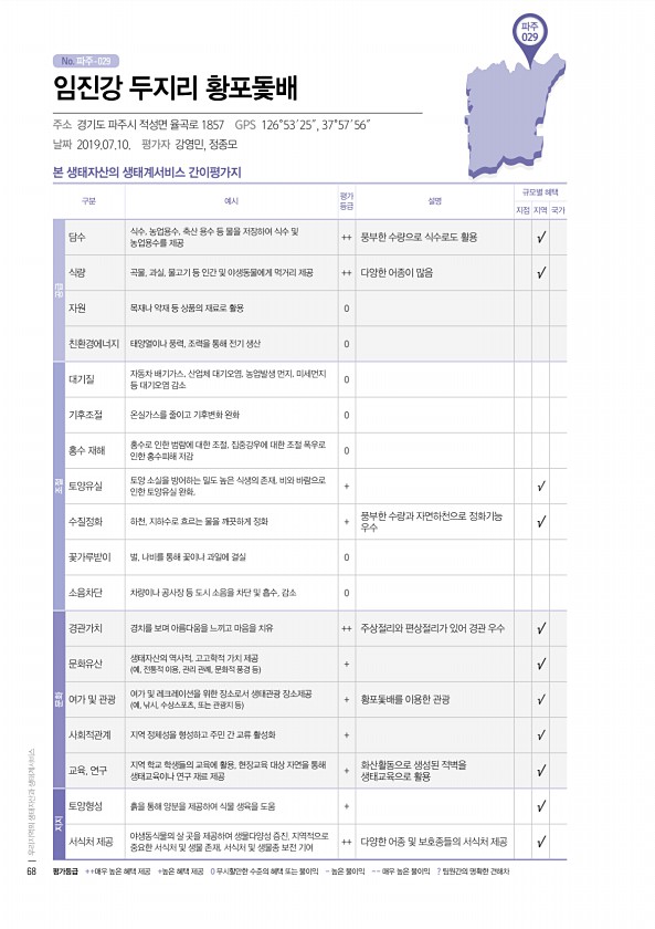 No. 파주- 본 생태자산의 생태계서비스 간이평가지 구분 예시 평가 등급 설명 규모별 혜택 지점 지역 국가 공급 담수 식수, 농업용수, 축산 용수 등 물을 저장하여 식수 및 농업용수를 제공 ++ 풍부한 수량으로 식수로도 활용 √ 식량 곡물, 과실, 물고기 등 인간 및 야생동물에게 먹거리 제공 ++ 다양한 어종이 많음 √ 자원 목재나 약재 등 상품의 재료로 활용 0 친환경에너지 태양열이나 풍력, 조력을 통해 전기 생산 0 조절 대기질 자동차 배기가스, 산업체 대기오염, 농업발생 먼지, 미세먼지 등 대기오염 감소 0 기후조절 온실가스를 줄이고 기후변화 완화 0 홍수 재해 홍수로 인한 범람에 대한 조절, 집중강우에 대한 조절 폭우로 인한 홍수피해 저감 0 토양유실 토양 소실을 방어하는 밀도 높은 식생의 존재, 비...
