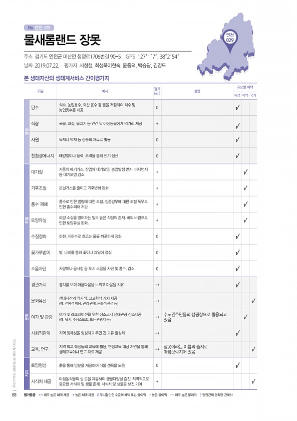 No. 연천- 연천 029 본 생태자산의 생태계서비스 간이평가지 구분 예시 평가 등급 설명 규모별 혜택 지점 지역 국가 공급 담수 식수, 농업용수, 축산 용수 등 물을 저장하여 식수 및 농업용수를 제공 0 √ 식량 곡물, 과실, 물고기 등 인간 및 야생동물에게 먹거리 제공 + √ 자원 목재나 약재 등 상품의 재료로 활용 0 √ 친환경에너지 태양열이나 풍력, 조력을 통해 전기 생산 0 √ 조절 대기질 자동차 배기가스, 산업체 대기오염, 농업발생 먼지, 미세먼지 등 대기오염 감소 + √ 기후조절 온실가스를 줄이고 기후변화 완화 + √ 홍수 재해 홍수로 인한 범람에 대한 조절, 집중강우에 대한 조절 폭우로 인한 홍수피해 저감 + √ 토양유실 토양 소실을 방어하는 밀도 높은 식생의 존재, 비와 바람으로 인한 토양유...